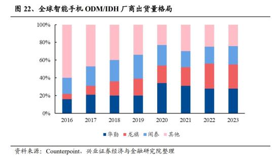 徐彦自2019年12月任大成睿享混合基金经理。据该基金2024年一季报显示,该基金目前规模46.78亿元,其第三大持仓股为华勤技术,股票持仓占比为4.55%。公司主要采用ODM经营模式,涵盖了智能手机、笔记本电脑、平板电脑、智能穿戴、AIOT产品、服务器等智能硬件产品的研发设计、采购、生产制造、物流、批量交付等各个环节,产业链条较为完整。全球智能机出货量正逐渐复苏,IDC预测2024年将同比+2.8%达12亿部,目前智能机ODM模式渗透率较低,随着智能机品牌加强成本管控,以及更贴近ODM价位段的新兴市场迎来强势复苏,Counterpoint预计2024年ODM/IDH模式渗透率将达到40%,公司智能机ODM市占率高,2023年为28%,全球第一。