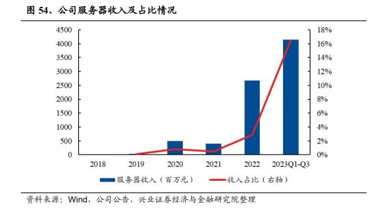 分产品来看,公司营收主要来源仍是智能手机业务,2022年收入占比为40.6%,较2018年的70.5%下滑29.9pct,笔电收入占比快速提升,2018年为4.1%,2022年已经提升至25.3%2023年数据业务营收同比增长3倍。3、积极布局笔电市场,已经覆盖联想、宏基等主流客户2015年公司开始进入笔电市场,充分发挥自身在智能机领域的技术优势,客户开拓顺利,目前主要包括联想、宏碁、华硕和小米等,公司笔电份额也逐渐提高,2021年笔电出货量超1000万台,市占率约5%,位列第6。根据Diaitimes,公司在2023年第二季度全球笔记本电脑ODM厂商出货量中进入前四位。兴业证券研报指出,目前笔电轻薄化趋势明显,公司作为智能机ODM龙头厂商在设计、生产体积较小旦高集成度的产品方面经验丰富,同时叠加智能手机品牌厂正逐渐进军笔电市场,公司有望拿到原先智能机客户的笔电ODM订单,份额增长空间大。4、服务器代工营收持续增长,AI服务器已率先完成与NVIDIA适配公司服务器收入占比还较小,但是增速可观,2022年实现收入26.7亿元,同比+565.8%,2023年营收同比增长3倍。