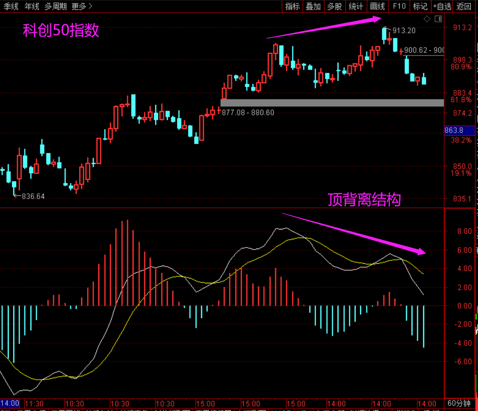 这是平均股价,从60分钟的角度看,今天第二个小时,平均股价形成了macd的死叉,也就意味着,形成了macd的顶背离结构。