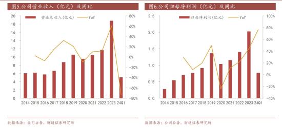 营收保持高增速,盈利能力持续增强。2023年公司营业收入为18.77亿元,同比+60.73%,增速达到近十年的最高值。2014-2023年公司营业收入CAGR为13.48%。2024Q1公司营业收入为5.06亿元,同比增加31.68%,主要系零部件业务开始放量增长;利润方面,2023年公司归母净利润为2.02亿元,同比+44.44%,202401归母净利润为0.76亿元,同比+76.75%。