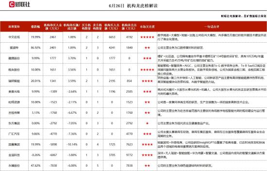 【北向资金今日净卖出19.82亿元 贵州茅台遭净卖出10.41亿元】财联社6月26日电,北向资金今日净卖出19.82亿元。贵州茅台、美的集团、赛力斯分别遭净卖出10.41亿元、4.39亿元、3.01亿元。中兴通讯净买入额居首,金额为1.47亿元。市场全天震荡反弹,创业板指领涨。盘面上,A概念股集体爆发,应用方向领涨,当虹科技、因赛集团、读客文化、新华网、掌阅科技等10余股涨停。PCB概念股探底回升,满坤科技、中英科技、天津普林涨停。汽车零部件板块表现活跃,金麒麟、天汽模、瑞玛精密、一彬科技涨停。锂电池概念股一度冲高,天力锂能、融捷股份涨停。总体上个股涨多跌少,全市场超4800只个股上涨。板块方面,AI语料、多模态、短剧、华为昇腾等板块涨幅居前,贵金属、ST等少数板块下跌。今日机构参与度较昨日有所提升,净买卖额超1000万元个股共13只,净买入5只,净卖出8只,其中净买入中文在线2461万、爱迪特2401万、融捷股份1777万,净卖出永臻股份7838万、金溢科技60567万、因赛集团5898万。中文在线:多模态+短剧+AI语料,公司是中国数字文化内容的开创者之一,是国内领先的数字版权供应商,旗下拥有原创网站17K小说网、四月天小说网等原创平台。目前,公司平台阅读业务:以自有原创内容平台、知名作家、版权机构为正版数字内容的资源超560万种,网络原创驻站作者450余万名;与600余家版权机构合作,签约知名作家、畅销书作者2,000余位。在原创内容平台方面,公司以全品类平台+垂类平台的方式,形成多维度发展的内容平台矩阵,兼顾内容的综合性与独特性,构建内容生态。根据《2023中国网络文学发展研究报告》显示,网文出海市场规模超过40亿元,海外访问用户约2.3亿,覆盖全球200+国家及地区,其中美国用户最多。海外子公司CMS已于2023年5月1日出表,目前系公司参股公司,公司持有CMS49.16%股份。CMS面向C端用户推出以互动式视觉阅读平台Chapters、动画产品Spotight、浪漫小说平台Kiss、真人短剧平台ReeShort等系列产品。公司已设立美国子公司COLMEDIA、新加坡子公司COLWEB、日本子公司COLJAPAN,在全球范围内多点布局,结合所在国的强势产业与海外本土市场特征,输出符合当地文化背景IP。此外,公司依托由小说和出版物所组成超过60TB的数据集,于2023年10月发布A1大模型“中文逍遥”1.0版本,实现一键生成万字小说、一张图写一部小说、一次读懂100万字小说等。帮助作者大幅提升内容生产效率,将更多精力投入到内容创意和构思生成工作。自2021年以来,公司使用“AI主播”进行内容生产,录制有声书时长超过18万小时,超过2500万字小说IP内容转化为外语版本并推向海外市场。互动易显示,公司在开源 A1 模型技术基础上利用公司在文学领域的语料数据,部署在自有服务器上进行AI大模型研发和训练,AI 多模态模型通过输入文字态的文学作品,可由A!模型转换成漫画形态,实现了!P的跨模态,加速了IP衍生品的变现,打开“"IP的生产力空间。+A!"税友股份:AIGC+智能管税+华为,公司主营业务是T0G数字政务业务、ToBSaaS订阅及咨询顾问服务两大主营业务板块。在数字政务领域,公司为国家金税三期、金税四期工程核心供应商,先后承接了国家个税税制改革服务项目、全国领先智慧电子税务局、大数据税收风险管理、全国电子发票等重大改革项目。据公司2023年年报,2023年度,公司B端数智财税云SaaS业务围绕数电票推广和用户不断深化的财税管理需求,推出“智能管税”"合规税优”等高价值产品,有效赋能财税服务行业数字化转型升级。为了支撑公司业务的可持续发展和商业模式升级,公司全面启动了垂直领域的财税大模型建设,并取得了较好的进展和成效。公司在互动平台上表示,华为作为税友股份的供应商之一,和公司长期保持着良好的合作关系。公司对业务一贯采取开放合作,互利共赢的态度。在人工智能技术积累方面,公司基于自然语义处理(NLP)、知识图谱、深度学习、情感计算等技术构建数智化运营体系,目前已逐步覆盖精准营销、自动商务计费、集约化标准化交付及智能应答等自动运营等场景。同时,公司着力打造财税垂直领域人工智能模型,模型参数已涵盖近800万企业、超1000万关系知识图谱,积累财税专业知识和服务案例库超过亿条,已成为全国最应大的财税知识库和人工智能数据底座。