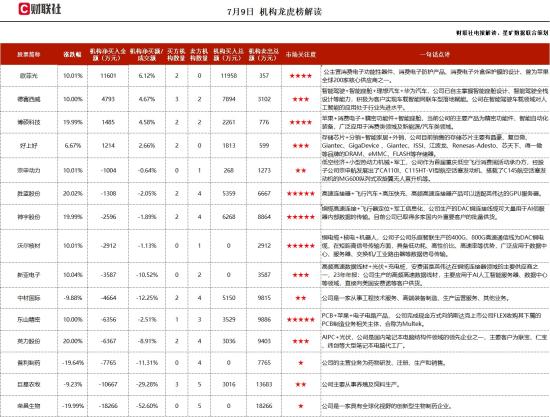 【龙虎榜|荣昌生物今日跌停 五机构合计净卖出1.83亿元】财联社7月9日电,荣昌生物今日跌停,成交额3.47亿元,换手率7.03%。龙虎榜数据显示,沪股通专用席位买入2623.23万元,五机构合计净卖出1.83亿元。市场全天低开高走,三大指数均涨超1%。盘面上,消费电子概念股集体爆发,德赛电池、国光电器、欧菲光、朝阳科技等近20股涨停。铜缆高速连接概念股再度大涨,胜蓝股份、神字股份、凯旺科技、沃尔核材涨停。半导体板块震荡走强,蓝箭电子、晶方科技、闻泰科技涨停。CPO、PCB概念股午后大涨,中际旭创、胜宏科技、沪电股份均创历史新高。总体上个股涨多跌少,全市场超4200只个股上涨。板块方面,铜缆高速连接、消费电子、半导体、CPO等板块涨幅居前,猪肉、ST板块、CRO、乳业等板块跌幅居前。今日机构参与度较昨日有所提升,净买卖额超1000万元个股共15只,净买入4只,净卖出11只,其中净买入欧菲光1.16亿、德赛西威4793万、博硕科技1485万,净卖出荣昌生物1.82亿、巨星农牧1.06亿、普利制药7765万。欧菲光:消费电子+华为+智能汽车,公司深耕光学光电行业二十余年,产品广泛应用于智能手机、智能汽车及其他智能应用新领域,主要包括光学摄像头模组、光学镜头、指纹识别模组、 3D TOF、智能驾驶、车身电子、智能座舱和智能门锁等相关产品。公司微电子团队2019年进入机器人赛道,推出TF避障模块。2024年推出双光源ToF专利架构方案,实现“避障+定位导航技术”、10米探测距离、低功耗、高采样率、低算力等优势。公司深度布局智能驾驶、车身电子、智能中控,以光学镜头、摄像头为基础,延伸至毫米波雷达、激光雷达、抬头显示 (HUD)等产品,为客户提供全方位的产品和服务。智能驾驶方面,目前公司正在开展激光雷达相关产品的研发。公司将推出纯固态的激光雷达方案,内部不包含任何旋转结构,在提供较高的探测距离和角分辨率的同时,还能提供车规级产品的可靠性和稳定性。公司是华为旗舰机型摄像头模组和屏下指纹等元器件的主力供应商之一。公司在VR/AR领域的产品布局包括光学镜头、影像模组、光机模组和整机组装制造等。在光学镜头方面,公司可以提供VR非球面透镜、VR/AR镜头组、VR目镜等产品。公司也将布局VR/AR眼镜和头戴式设备的整机组装制造服务。德赛西威:智能驾驶+英伟达,公司的L3级别自动驾驶域控制器已在小鹏汽车的车型上配套量产。除了L3级别自动驾驶,公司在其他自动驾驶领域也正积极布局,公司在新加坡成立了研发团队,专门开发L4和L5级自动驾驶和汽车网络安全的前沿技术。获得新加坡陆路交通管理局颁发的无人驾驶车辆第一阶段路测的牌照。公司与华为签署全场景智慧出行生态解决方案合作协议,围绕HiCar解决方案平台级合作、测试能力共建、车载生态联合创新等方面建立深度合作项目。和华为合作带有Hicar功能的主机已在多个OEM项目中应用。互动易显示,公司第三代高性能智能座舱产品已实现规模化量产,并新获得长安福特、吉利汽车、比亚迪汽车、广汽乘用车、合众汽车等多家主流客户的项目定点:新一代更高性能的第四代智能座舱系统已获得新项目定点。华西证券研报指出,高级自动驾驶域控制器产品公司现已累计获得超过10家主流车企的项目定点,包括传统自主品牌客户和新造车势力,预计单车ASP达1-2万元。公司作为现阶段英伟达国内核心合伙伙伴,将持续受益高级别自动驾驶导入。