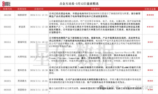 【点金互动易)芯片封装+华为,细分设备国内市占率超7成,在多个领域为华为提供定制设备及配套技术服务,这家公司设备可满足存储芯片和算力芯片先进封装工艺要求往期回顾:3月10日20:53《电报解读》跟踪到飞行汽车最大订单诞生,随即发文并引用机构观点指出:预计2030年飞行汽车全球市场规模将达到3000亿美元,产业链上下游环节或迎来发展契机。文章提及万丰奧威,公司在3月11日收获涨停。·新益昌:公司掌握固晶机相关核心技术,可广泛应用于半导体、电子、光电、仪器仪表、医疗设备和通信等领域,因此公司固晶机并非专供于某特定客户。华为是公司长期保持紧密合作和沟通的重要客户之一,公司目前主要在半导体先进封装及高清显示领域为华为提供定制设备及配套技术服务。公司设备可以满足存储芯片和算力芯片先进封装的工艺要求,相关设备正按计划推进中。公司主要从事半导体、LED、电容器、锂电池等智能制造装备行业。公司作为国内LED固晶机领先企业,在国内市场占有率已经超过70%,客户普及率也已超过9成。公司的半导体封测业务涵盖MEMS、模拟、数模混合、分立器件等领域,为包括晶导微、灿瑞科技、扬杰科技、通富微、固锝电子、华天科技等知名公司在内的庞大优质客户群体提供定制化服务。公司锂电池设备主要涉及卷绕机、制片机及制片卷绕一体机等产品。瑞泰新材:公司已经在固态电池、半固态电池等新型电池材料方面进行了持续的研发与积累,部分新型锂盐产品在固态锂离子电池等新型电池中已形成批量销售。公司为电解液行业领军者。公司向宁德时代供应锂离子电池电解液,宁德时代是公司近三年前三大客户之一。公司的动力电池电解液纯度较高,能够满足动力电池对于大容量、循环寿命长以及高低温性能稳定等要求。公司在欧洲市场已有布局。波兰华荣新建Prusice 年产4万吨/年锂离子动力电池电解液项目已于2022年投入使用,主要客户为周边锂离子电池企业。双三氟甲基磺酰亚胺锂(LTFSI)是公司重要的新型锂盐产品之一,已应用于固态锂离子电池等方面,目前全国、全世界能够量产上述产品的公司仅有少数几家。公司与国内外多家固态锂离子电池企业均有合作。公司开发的阳燃型电解液能够捕捉燃烧反应过程中的自由基实现阻燃的效果,综合提升电池安全性能。公司凝胶态电池材料正处于中试阶段。