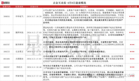 中科电气:公司主要产品为负极材料,主要客户包括宁德时代、比亚迪、中创新航、亿纬锂能、瑞浦兰钧、蜂巢能源、海辰储能、ATL、LGES、SK On等国内外知名电池企业,随着锂离子电池应用场景的增加,将会带动相关电池及其负极材料需求的增加。当前固态电池有多种技术路线,不同技术路线对负极材料需求有差异,包括硅碳负极和锂金属负极等负极材料在固态电池中可以应用。针对固态电池不同的技术路线,公司在相关硅碳负极、锂金属负极等方面均有开发和产品布局。公司是最早布局锂电池负极材料的企业之一,二十余年来,通过不断的技术创新和产品升级,在锂电池负极材料特别是快充类负极材料领域保持了较优的技术领先性,高压快充以及超充类负极材料产品成功在客户端得到批量应用,并获得广泛好评。海外市场是公司的重要战略市场,目前对LG新能源、SKOn均实现了批量供货,其他海外客户的开拓正按计划进行。2023年5月前公司已经完成硅基负极的中试线建设,并给下游客户送样验证。捷邦科技:固态电池是一大类电解质以固态形式存在的电池。其所用正极涵盖现在锂离子电池正极和硫等,负极则为碳/硅/锡等IVA族、金属氧化物和锂。除了锂负极外,其余大部分正负极材料都存在电子导电性低的问题,需要添加化学惰性的碳类导电剂。碳纳米管在力学、电学、热学和化学稳定性等方面较传统导电剂有明显优势,在固态电池上有较大应用潜力。公司可以依照客户需求,定制开发应用于固态电池的碳纳米管产品。公司消费电子领域产品为精密功能件及结构件产品,主要应用于平板电脑、笔记本电脑、一体机电脑、智能家居等消费电子领域,终端客户主要为苹果、谷歌、亚马逊、SONNOS等知名品牌厂商。截至2023年三季度,公司碳纳米管业务主要客户为:鹏辉能源、正力新能、多氟多、精锐电池、孚能科技等。此外,宁德时代客户产品还在验证及少量交货测试阶段。